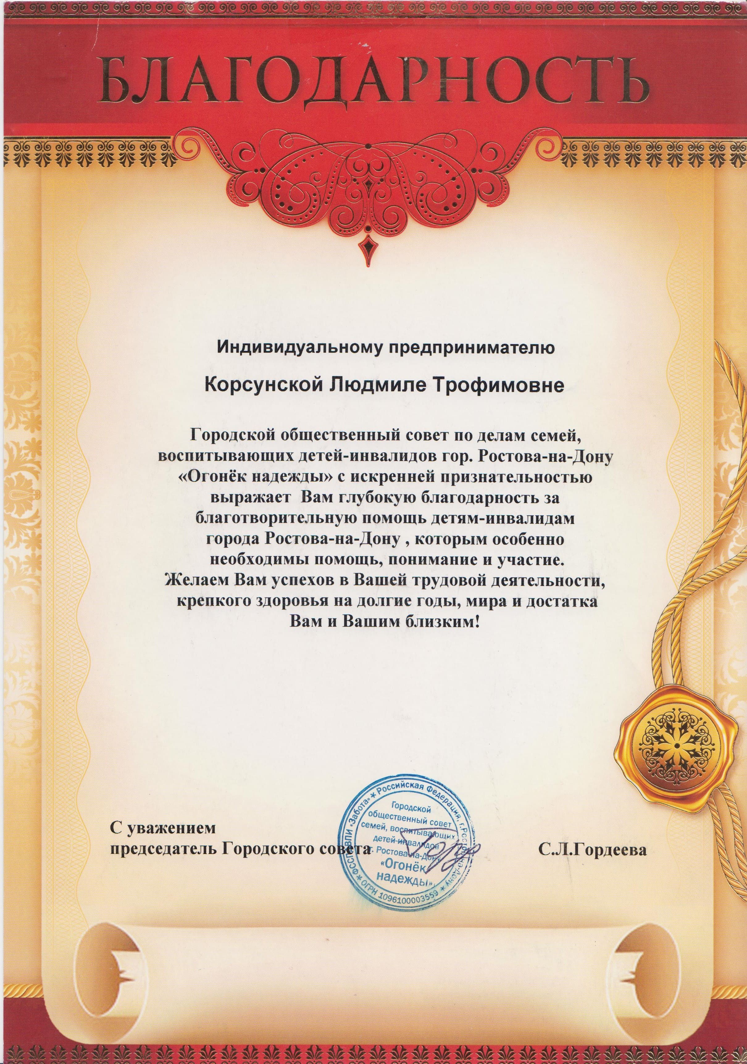 Благодарность от БО «Огонёк Надежды‎» 2013 г.