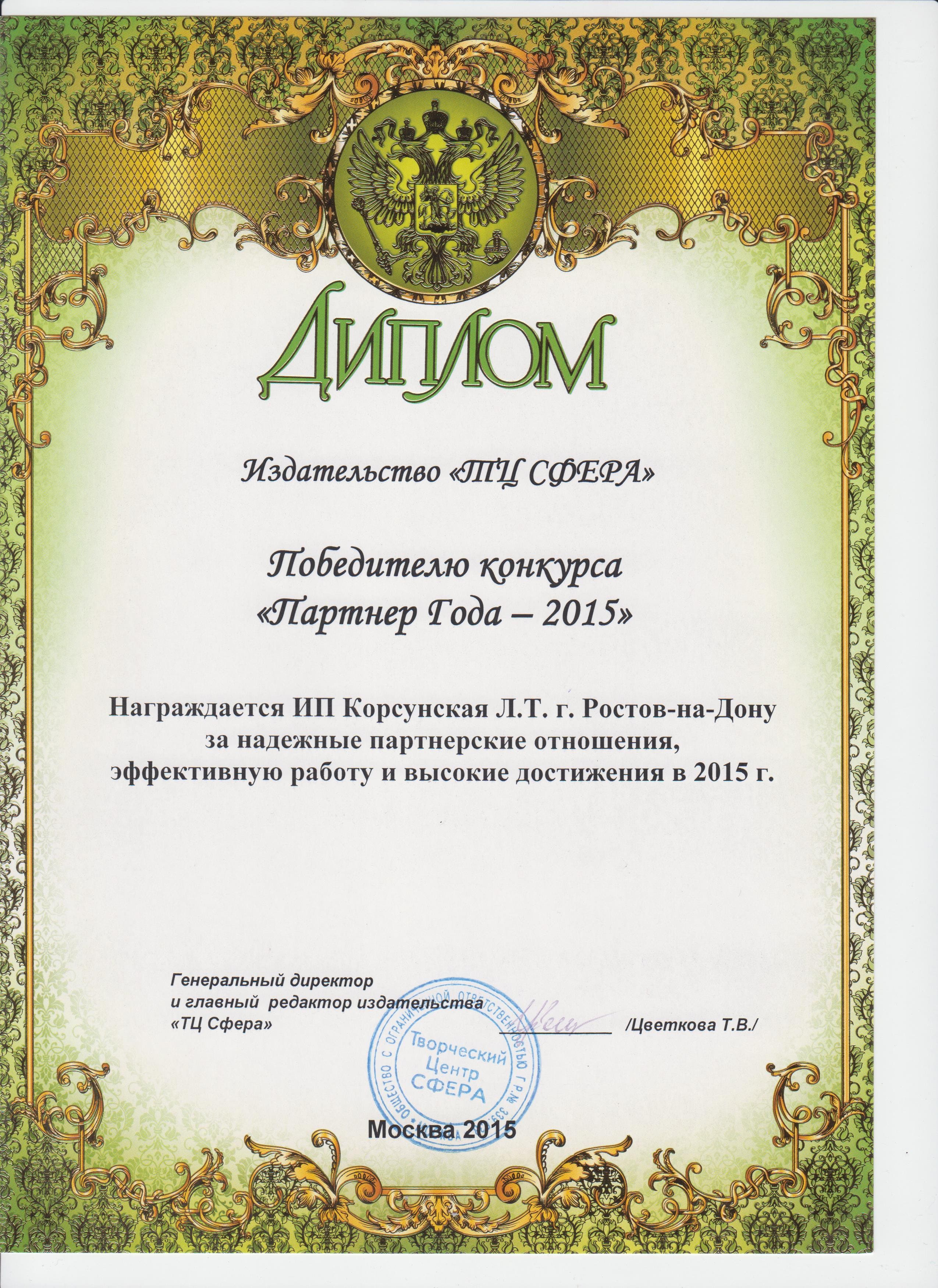 Награда "Партнер года 2015 ТЦ Сфера" за плодотворное сотрудничество и активное участие в закупках.